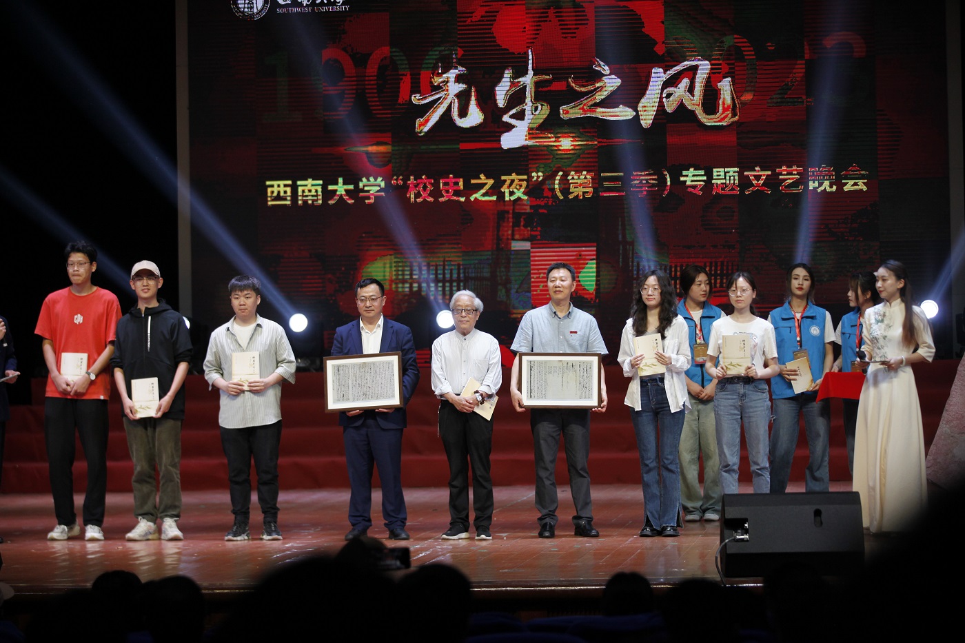 晚会上,除师生们耳熟能详的国学大师吴宓、土壤学家侯光炯、杂交水稻之父袁隆平外,学生演员们还通过情景讲述、档案故事等形式,讲述了九三学社创始人之一的劳君展教授、著名学者台静农教授、音乐家吴伯超,曾在荣昌校区前身学校工作的蔡无忌教授、柑研所首任所长、果树学专家曾勉教授和书画名家苏葆桢教授、农业经济专家叶谦吉教授、美育心理学家刘兆吉教授,今年去世的魔芋研究专家刘佩瑛教授、大熊猫研究专家、校友胡锦矗教授等名家大师的感人故事。一位位“大先生”的形象,跃然台上,现场师生感动不已。